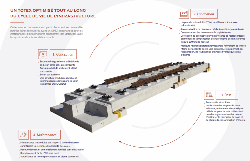 - Coûts réduits grâce à la possibilité de production locale des éléments préfabriqués (partenariat avec l’industriel B-RAIL) è référence au site dédié à la VSD SYSTRA : Voie sur dalle : une solution durable made in France | B-RAIL