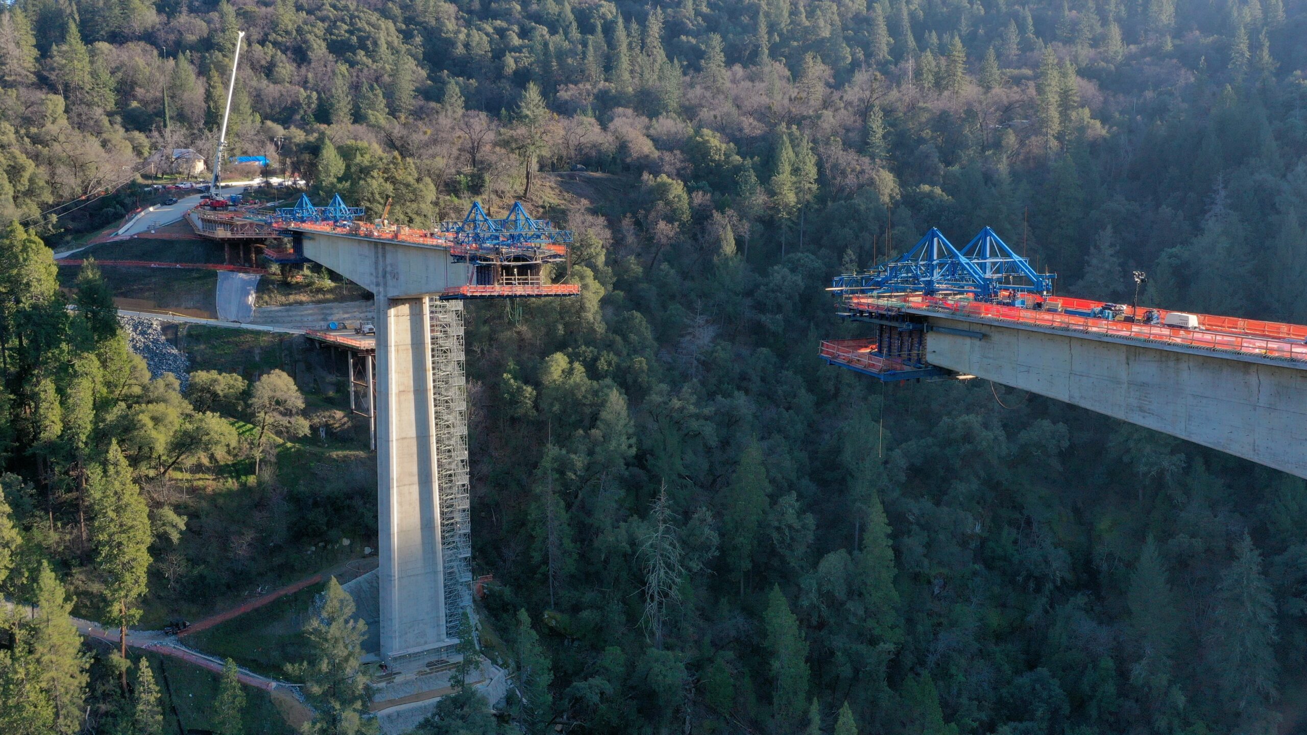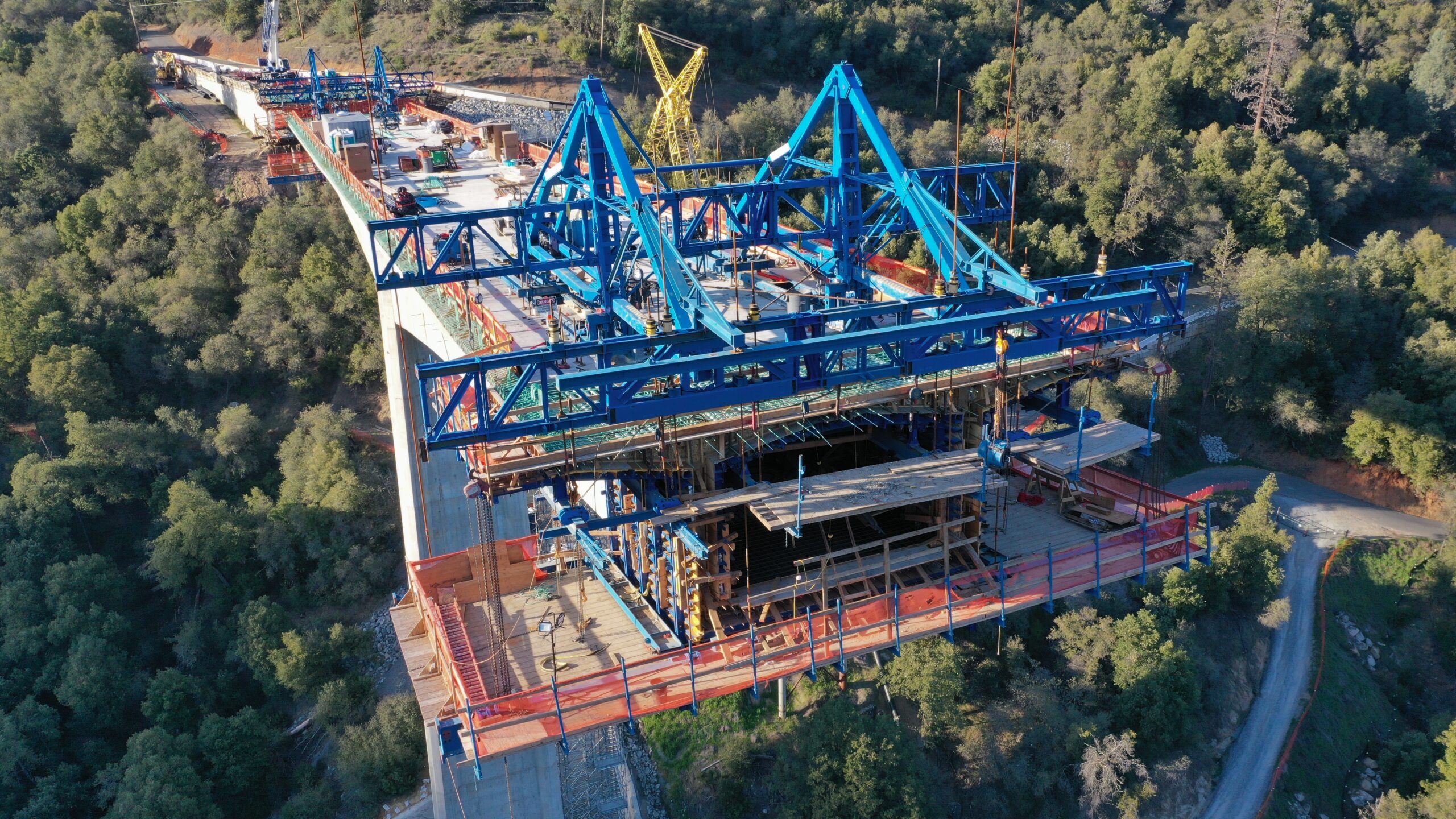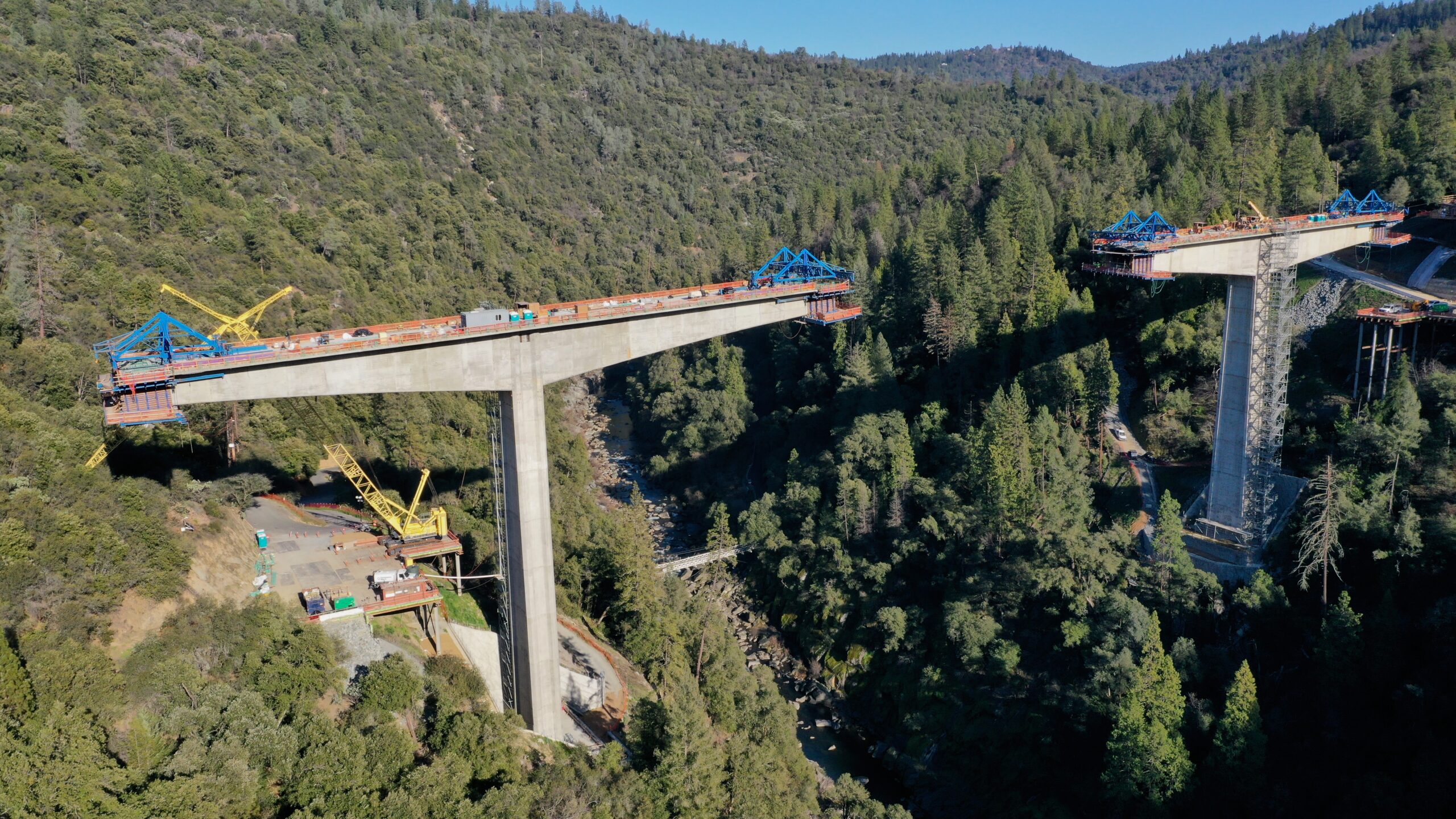 The three-span post-tensioned concrete box girder bridge has a 536 ft (163.4 m) main span with 322 ft (98.2 m) end spans. The bridge, which is constructed using the cast-in-place balanced cantilever segmental method, varies in depth from 12 ft (3.66 m) to 30 ft (9.15 m) and is supported by two hollow main piers consisting of 5 ft (1.52 m) confined corner octagons joined by 2 ft (0.61 m) wide walls. The columns rise nearly 200 ft (61 m) above the CIDH-supported footings, and the roadway reaches heights of approximately 375 ft (114 m) above the river.