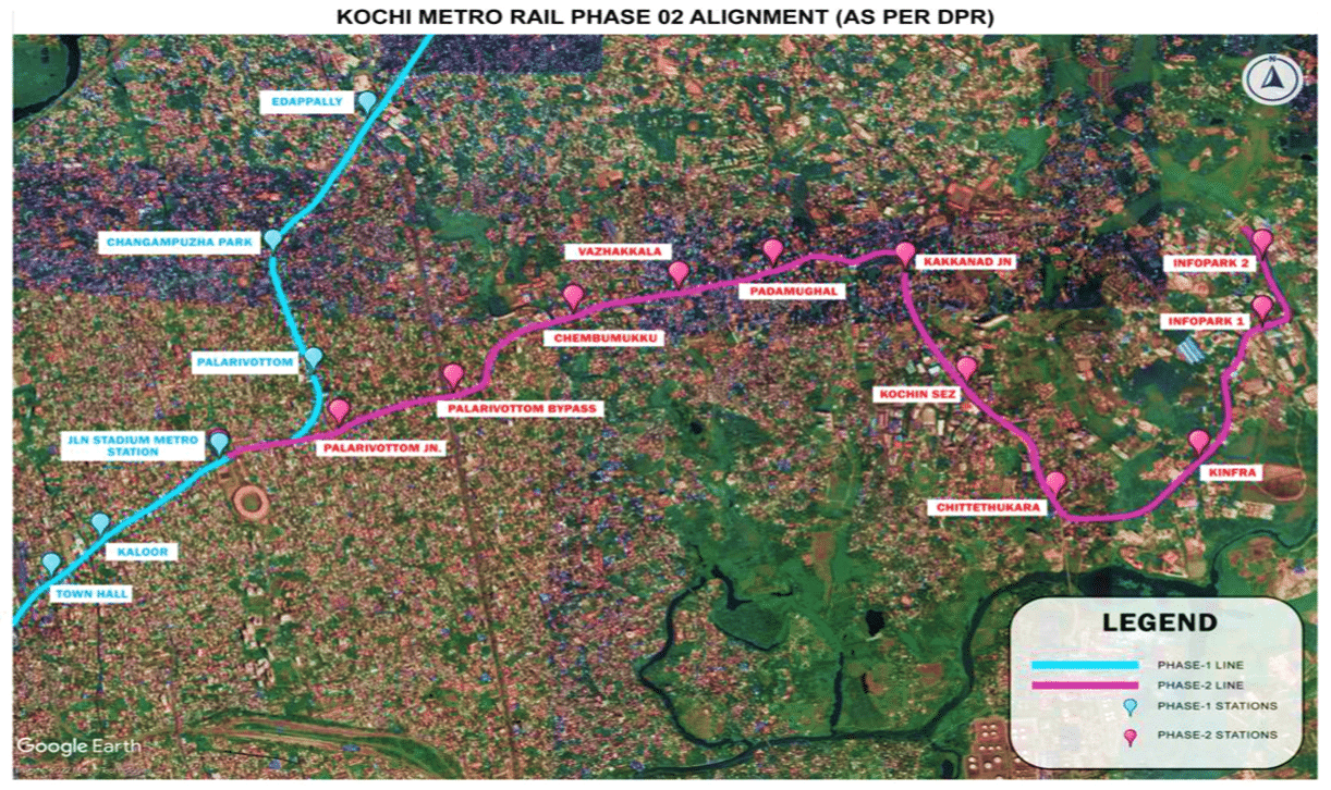- 11.2 km Elevated Pink Line: Fully elevated viaduct corridor extends Phase-I at JLN Stadium to Infopark/Smart City via Kakkanad. It is designed for seamless integration with the existing metro network.