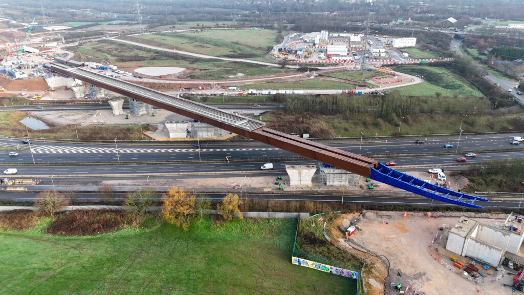 While the previous slide had required a weekend closure of the main carriageway, the team – led by HS2’s main work contractor Balfour Beatty VINCI (BBV) – worked closely with National Highways to develop the ‘fully restrained’ process which allowed them to safely slide the final section above the moving traffic. It is thought to be the first time this technique has been used on a UK motorway.