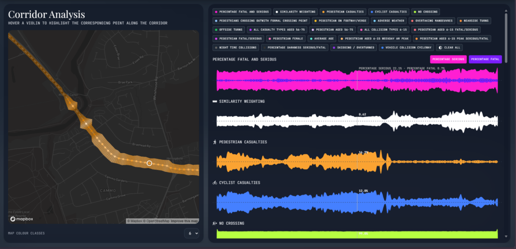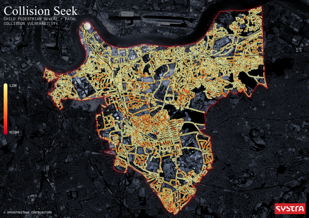 Collision Seek follows a three-stage predictive analysis framework. It aggregates STATS19 collision data across similar physical environments nationwide. It then analyses key physical features such as road markings, pedestrian crossings and buildings to understand collision risk patterns. The tool finally evaluates relative risk across entire road systems to identify locations where specific users are most vulnerable – including pedestrians and cyclists.