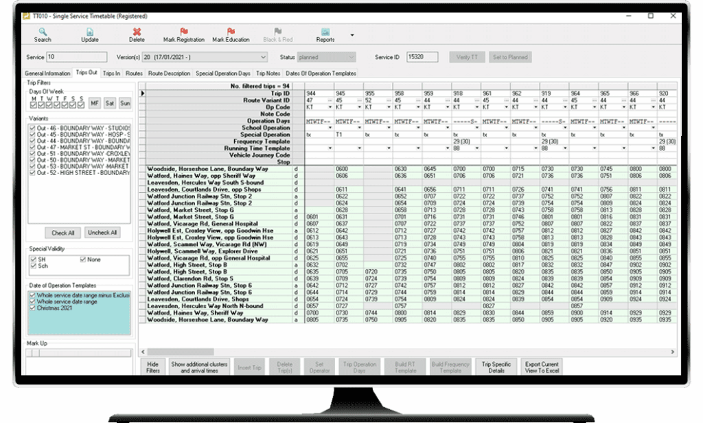 - Timetable management: Maintain bus timetable trips by defining routes, timing points, and operating calendars. This includes managing special days of operation like Christmas and bank holidays.